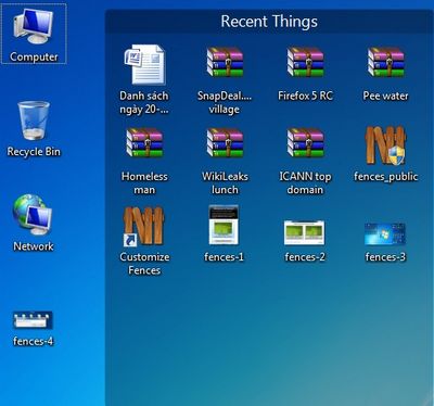 Đặc biệt Fences còn cung cấp một tính năng khá độc đáo, đó là cho phép bạn ẩn đi toàn bộ các biểu tượng trên desktop (kể cả các nhóm biểu tượng đang có) bằng cách kích đôi chuột vào một vị trí trống bất kỳ trên desktop. Để hiển thị lại danh sách các biểu tượng (và các nhóm biểu tượng), bạn chỉ việc kích đôi vào một vị trí bất kỳ khác trên desktop.