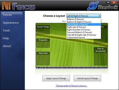 Tại mục Fences (từ menu bên trái), cho phép người dùng thiết lập vị trí của các nhóm biểu tượng trên desktop. Mục Choose Layout cho phép người dùng di chuyển các nhóm biểu tượng nằm về một góc màn hình hoặc chia đều 2 bên trái phải…