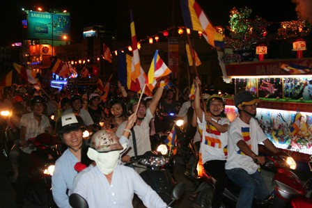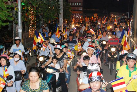 gắn máy được các phật tử tại gia cầm cờ chạy theo. Lần lượt từng xe hoa