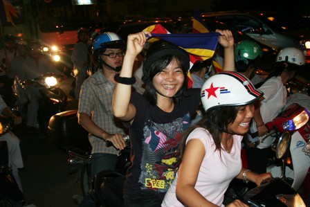 xen lẫn những đoàn xe cổ động di chuyển chậm trong những hàng người bao
