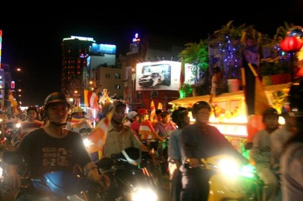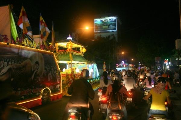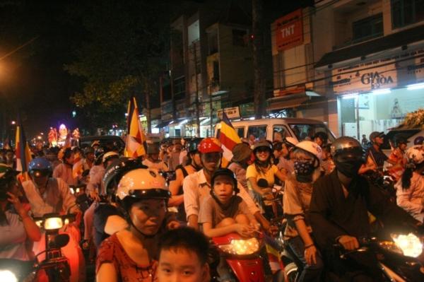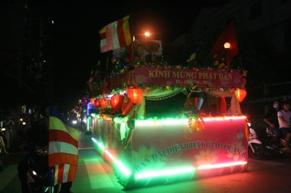 Có thể gọi đêm diễu hành xe hoa tối nay 4-5 (14 tháng 4 Nhâm Thìn) là đêm của lễ rước Phật đản sanh thiêng liêng, lộng lẫy sắc cờ hoa, âm thanh và sự chuyển động linh diệu. Từ các nẻo đường của 24 quận huyện, 38 chiếc xe hoa thắm sắc cờ hoa, tôn trí tượng Bổn sư Đản sanh đã hòa vào dòng người để từ đây những dòng sắc màu lung linh chuyển động trong đêm huyền diệu…