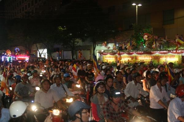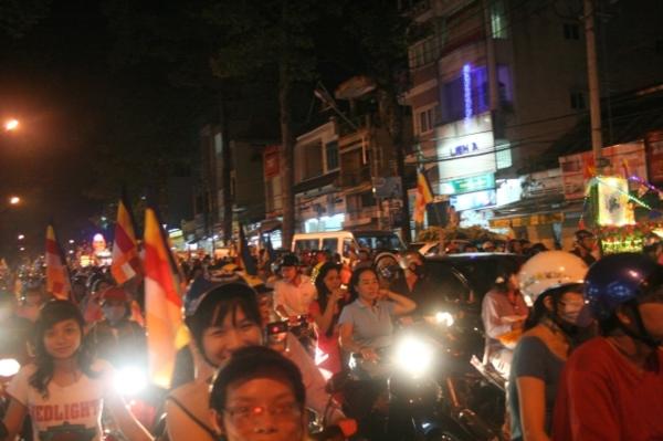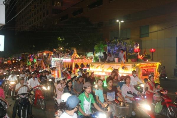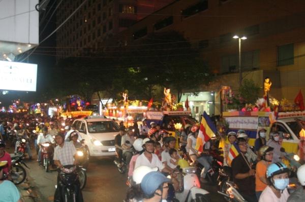 Có 38 chiếc xe hoa của các quận huyện trong toàn thành phố diễu hành tối nay theo lộ trình bắt đầu từ điểm tập trung (Đài Liệt sĩ quận 3) đến chùa Vĩnh Nghiêm, quận 3; Việt Nam Quốc Tự; chùa Ấn Quang, chùa Hưng Long ( quận 10); đường Hồng Bàng, Châu Văn Liêm), Nguyễn Trãi, Nguyễn Tri Phương, Trần Phú, Trần Hưng Đạo (quận 5); Công trường Quách Thị Trang (quận 1); Công viên Bồ-tát Thích Quảng Đức ( quận 3) và các xe hoa trở về quận huyện.