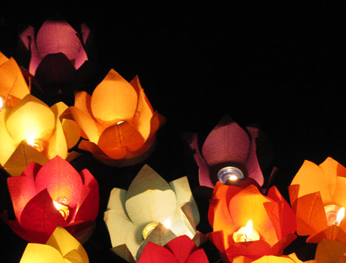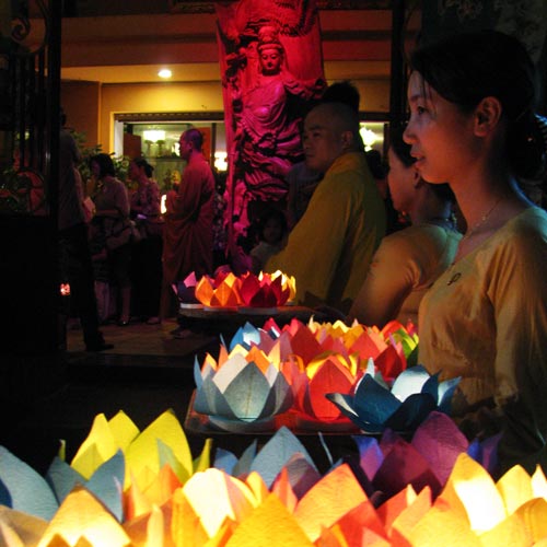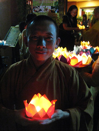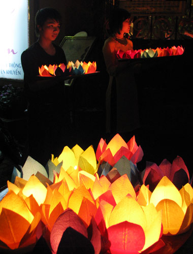 hoa đăng, thưởng thức cơm chay, giảng pháp, tụng kinh cầu cho quốc thái