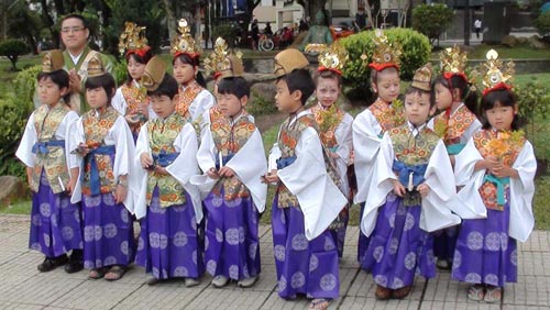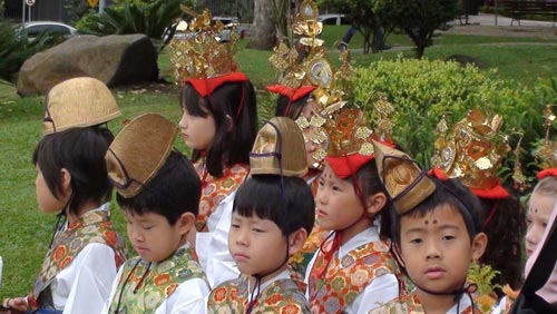 kimono, tay cầm hoa tươi. Các em hát những bài ca Phật giáo và lễ hội