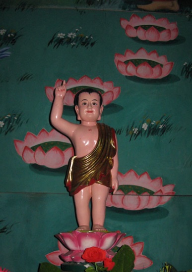 Trong các ghi chép về sự kiện này, có lẽ nội dung đoạn văn trong kinh Dirghagama (Trường A Hàm) là đáng chú ý nhất: Thái tử Sakyamuni Gautama, khi vừa sinh ra đã đi bảy bước về mỗi phía trong bốn phương và chỉ tay phải lên trời, tay trái xuống đất, tuyên bố: “Thiên thượng thiên hạ, duy ngã độc tôn”. Dưới mỗi bước chân của thái tử, đất nẻ ra, mọc lên một đoá sen… Ở đây có hai biểu trưng cần xem xét trước tiên: hoa sen và con số 7.
