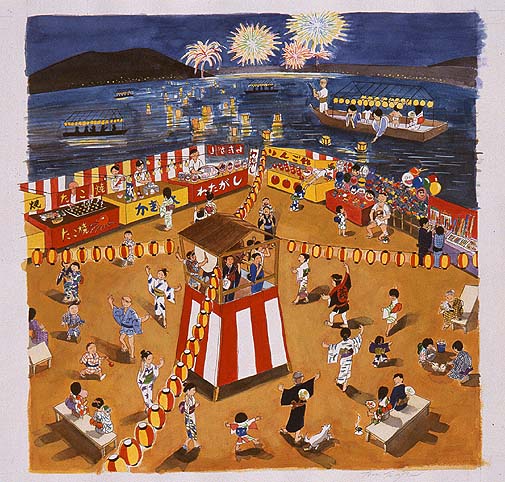 Đêm về, hàng trăm ngàn dân chúng ở khắp nơi trên đất Nhật, lũ lượt đi ra các bờ hồ, chen chúc nhau mua những chiếc lồng đèn nhỏ hình vuông bằng giấy, người ta làm sẵn để bán cho khách thập phương. Bên trong mỗi chiếc thuyền lồng đèn, có thắp một ngọn nến chiếu sáng dòng chữ Nhật in trên lồng đèn như sau: “Lễ tiễn đưa các vong hồn về thế giới bên kia”. Nhiều người cẫn thận hơn, tự mình hoặc nhờ một nhà sư viết tên họ hương linh thân nhân quá cố của mình trên những chiếc lồng đèn ấy, trước khi thành kính thả chúng xuống trôi theo dòng nước tĩnh lặng trong đêm tối. Rồi không bao lâu, trên khắp các mặt hồ ngập đầy vô số những chiếc lồng đèn giấy nhấp nhô trên sóng nước, qua những ánh nến lung linh, chập chờn huyền ảo, để từ từ chúng biến mất, chìm dần cuốn trôi theo dòng nước.