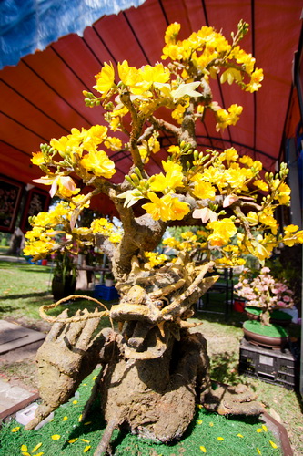 Chậu hoa mai thân hình rồng bằng đất sét độc đáo này được những người thợ quận Hóc Môn, TP.HCM nặn và gia công trong ba tuần - Ảnh: Tiến Thành