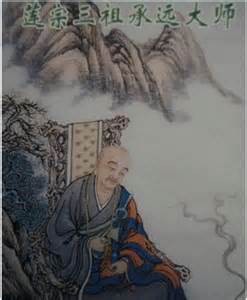 三祖承遠大師(712802)唐代僧,為淨土宗第三祖。漢州(四川廣漢)人,俗姓謝。早先就學于成都唐公,年二十四時,出蜀到荊州玉泉寺,依惠真剃度學道。後遵師命去衡山(今湖南省衡山市西南),從通相受具足戒,並跟他學經、律。後聽說,慧日師到了廣州,便去求法。慧日法師開示說:不可獨然獨善,應依《無量壽經》修念佛三昧,以救濟群生!天寶元年(西元742年)重回衡山,始居衡山西南之石下,僅安置經像,精苦修道,有人供養食物則食,無人供養則食土泥茹草木,衣著但求禦寒蔽體。來求道的人,常見到一人身形叟小,塵垢滿面,負薪擔水,都以為是大師的侍者而輕慢之,待後方知他就是大師。