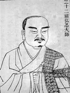 弘忍,俗姓周,湖北黃梅人,生於隋仁壽元年(601)。七歲時,從四祖道信(580—651)出家,年十三,正式剃度為僧。他在道信門下,日間從事勞動,夜間靜坐習禪。道信常以禪宗頓漸宗旨考驗他,他觸事解悟,盡得道信的禪法。永徽三年(651)道信付法傳衣給他。同年九月道信圓寂,由他繼承法席,後世稱他為禪宗第五祖。因為四方來學的人日多,便在雙峰山的東面馮茂山另建道場,名東山寺,時稱他的禪學為東山法門。
