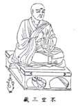 不空(705~774),全稱不空金剛(是他受灌頂的號),是獅子國(今斯里蘭卡)人,生于公元705年(唐神龍元年),自幼喪父,隨其叔來住東海,14歲時在阇婆國(今印度尼西亞爪哇)遇見密宗大師金剛智,隨侍受學,并同來中國,720年(開元八年)到洛陽。20歲時在洛陽廣福寺受具足戒。此后廣學唐梵經論和密法,在金剛智譯場充當譯語,盡傳其學。金剛智逝世后,不空秉師遺命并攜朝廷國書,于天寶元年(742)率領弟子含光、慧、李元宗等僧俗37人,乘昆侖舶,經訶陵國(在今爪哇中部)到達獅子國。因是大唐來使,不空受到獅子國王尸羅迷伽的優禮接待,安置于佛牙寺。不空遂依止普賢阿阇黎,入壇重受金剛頂瑜伽秘密總持、五部灌頂、曼荼羅法、三十七尊、護摩等法,前后三年;并廣事搜求密藏和各種經論,獲得陀羅尼教《金剛頂瑜伽經》等80 部,大小乘經論20部,共計120卷。不空返唐時,獅子國王尸羅迷伽請附表,并托獻方物,不空遂同使者彌陀攜帶獻物和梵夾等,于天寶五年(746)到達長安。他奉敕在淨影寺從事翻譯,并被延至宮中,設內道場,為玄宗等灌頂,又開壇廣為四眾授法。后因其祈雨止風有驗,賜號“智藏”。肅宗至德元年(756),不空奉敕從武威還都,住興善寺開壇灌頂。后來長安被安祿山攻陷,不空仍然秘密派人向肅宗奉表起居,“又頻論克復之策”。因此至德二年(757)肅宗還都以后,不空備受皇帝的禮遇。乾元元年(758),不空上表請搜訪梵文經夾加以修補,并翻譯傳授,得敕許將中京(長安)慈恩、荐福等寺,東京聖善、長壽等寺,以及各縣寺舍、村坊,凡有舊日玄奘、義淨、善無畏、流支、寶勝等三藏所帶來的梵夾,都集中起來,交給不空陸續翻譯奏聞。這是唐代對梵文佛典的一次大規模的集中(在興善寺)。可惜會昌五年(845)唐武宗滅法,大興善寺被毀,大批的梵夾也就損失了。