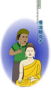 優婆離在僧團中被公認為持戒第一,他經常向佛問戒。如迦毗羅的釋迦族,法律規定:凡釋迦族女子,不得嫁給別族的男人,犯者治以重罪。當時釋迦族黑離車女,青年喪失,有許多異族青年向她求婚。可是丈夫的弟弟想將她占為己有,不允許她外嫁,並把她打傷。此人即逃到祇園隨比丘尼出家。迦毗羅國政府到處通緝此女。