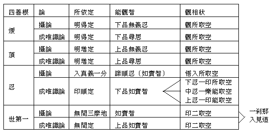 忍是印所取空,中忍是樂能取空,上忍是印能取空,且是以印順定為觀的所依定。即是說《攝論》在忍位所達到之層次只到《成論》的下忍位,但從中忍至世第一的