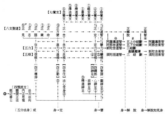 『在個人修學的程序上,這七類道品──三十七菩提分法,都是需要的;是淺深次第的差別,而一類類的進修。這是說:『初修學時,修四念處; 到了煖位,修四正勤;頂位修四神足;忍位修五根;世第一位修五力;見道位修八正道;修道位修七覺支,但這也不過約特勝的意義說說而已。』(妙 中五) p.229