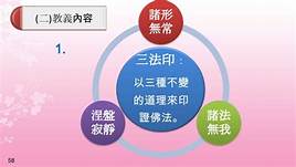 三法印是佛法的根本大綱,不僅說明宇宙人生生滅變化的現象,也詮釋諸佛寂滅無為的解脫境界,是涵括世間法與出世間法的三條定律: