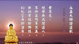 「我師得見然燈佛」:我師—這是永嘉大師稱我師,我師是誰呢?就是釋迦牟尼佛,他是所有佛子的師父,所以才這樣親切地叫我師。得見然燈佛,我的師父釋迦年尼佛,在過去遇見然燈佛,然燈佛就給釋迦牟尼佛授記。