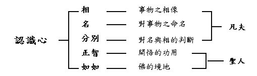(1) 認識心 從小乘的觀點談認識心,名為心、意、識,此三個名相,或有多義,或為一義,一義即是三種名稱雖不同,而其所指則為一,多義即是三種名稱含有三種不同的意 義。有說:「意」為過去,「心」乃未來,「識」為現在。有說,在六根、六境、六識的十八界中設「心」;在六根、六境的十二處中許「意」;在色、受、想、 行、識的五蘊中設「識」。實則,此三名所指,仍是一樣東西,即是認知及辨別的心理現象。