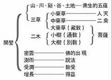 迦葉。譬如三千大千世界山川谿谷土地。所生卉木叢林。及諸藥草。種類若干。名色各異。密雲彌布。遍覆三千大千世界。一時等澍。其澤普洽卉木叢林。及諸藥草。小根小莖。小枝小葉。中根中莖。中枝中葉。大根大莖。大枝大葉。諸樹大小。隨上中下各有所受。一雲所雨。稱其種性而得生長。華果敷實。雖一地所生。一雨所潤。而諸草木。各有差別。