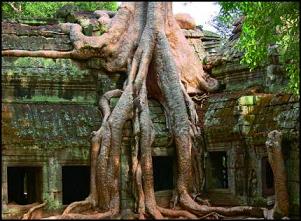 Unlike most Angkorian temples, Ta Prohm has been left in  almost the same condition in which it was found. The atmospheric combination of trees growing out of, and over, the  ruins and the jungle surroundings make it one of Angkor’s most  photogenic temples.
