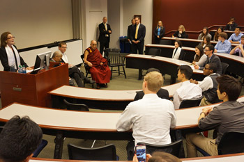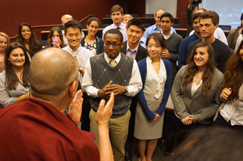 His Holiness the Dalai Lama visiting a Business Studies classroom and interacting directly with the students on the topic of Secular Ethics during his visit to Emory University in Atlanta, Georgia on October 10, 2013. Photo/Jeremy Russell/OHHDL