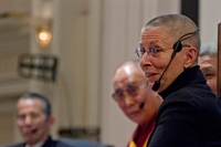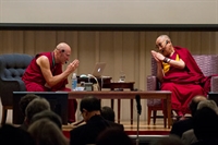 His Holiness the Dalai Lama thanking Ven Dr Barry Kerzin for his presentation during the second day of the Mapping the Mind conference in Kyoto, Japan on April 12, 2014. Photo/Office of Tibet, Japan