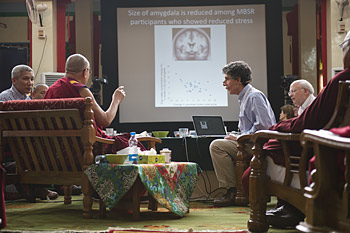 | | Richard Davidson during his presentation at the Mind and Life XXVI Conference held at Drepung Monastery in Mundgod, India, on January 17-22, 2013. Photo/Tenzin Choejor/OHHDL | As part of his ongoing research, Dr. Davidson last year connected French monk Matthieu Ricard to 256 sensors and asked him to meditate on compassion. The scans of his brain showed an extraordinary level of gamma waves (activity linked to consciousness, learning and memory), “levels never reported before in the neuroscience literature”, the scientist said.