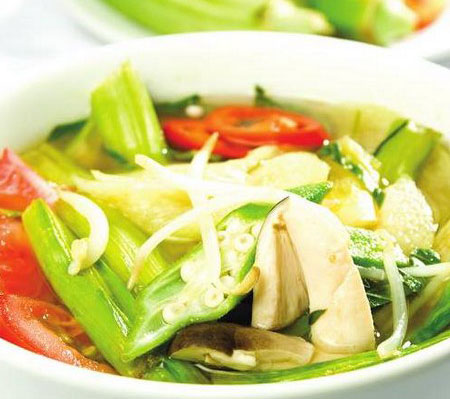 1 quả cà chua, đậu bắp, dọc mùng, nấm rơm, dứa, 1 quả me, giá, hành, ngổ…