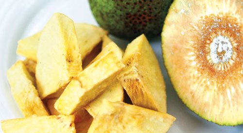 Sa kê chiên giòn: Trái sa kê chứa nhiều tinh bột, còn được gọi là “trái bánh mì”, chế biến được nhiều món ăn rất ngon. Chọn mua sa kê trái già, cứng, da còn xanh. Gọt vỏ, chẻ làm tư, ngâm trong nước có pha chanh để sa kê không bị thâm đen. Vớt ra xắt miếng vừa ăn, để ráo, ướp chút bột nêm chay và hành boa rô xắt nhuyễn. Bột chiên giòn pha sền sệt. Bắc chảo dầu lên, dầu nóng nhúng sa kê vào bột cho đều rồi thả vào chảo chiên đến khi vàng đều, vớt ra để ráo dầu. Làm tương chấm: dùng tương hột xay nhuyễn, bỏ vào chảo dầu đã phi boa rô thơm, rồi đảo đều, nêm đường, muối và một ít nước tương cho vừa ăn, pha bột năng loãng rồi đổ vào, đảo đều, khi sôi nhấc xuống. Múc ra chén cho ít ớt băm vào. Sa kê chiên giòn dùng với xà lách và chấm tương.