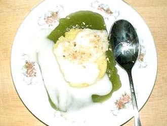 Nước dừa, lá dứa, đường, 1 tí muối, bột năng và vanilla khuấy đếu trên