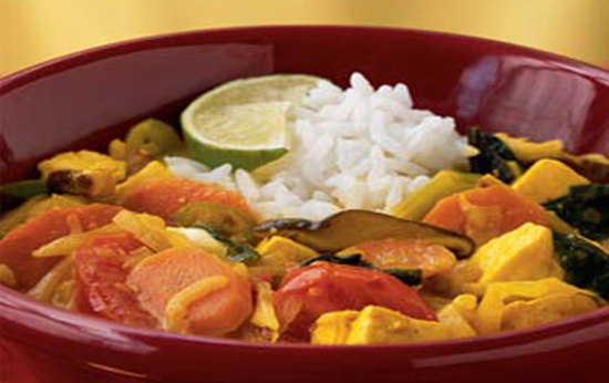 Lẩu dùng với cơm. Trang trí chanh cắt lát và rau húng trên bề mặt cho đẹp.