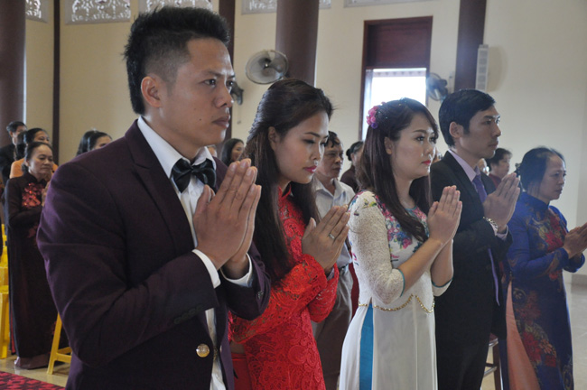 Sau khi lắng nghe quý Thầy tuyên đọc ý nghĩa Chiếc Nhẫn, càng cảm thấy như được thấm nhuần hơn những lời Phật dạy để ứng dụng vào đời sống gia đình, các tân lang và tân nương được chính thức trở thành vợ chồng qua phần nghi lễ “ Trao nhẫn cưới”.