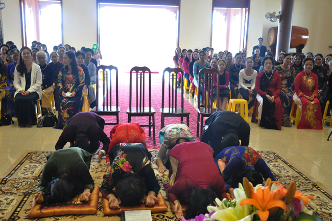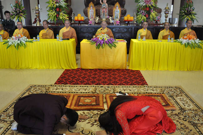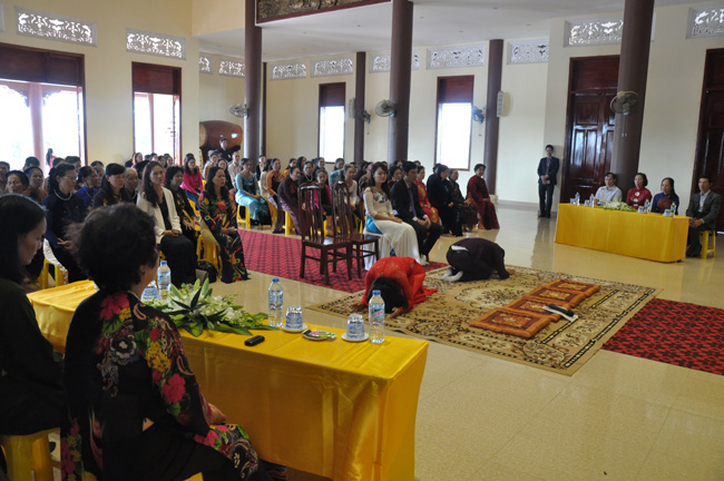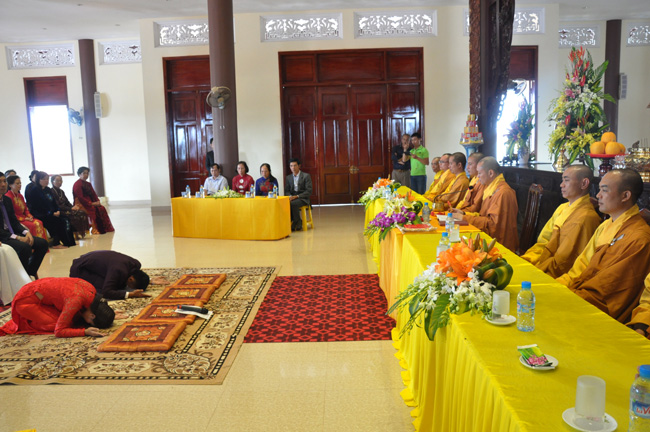 Sau khi quý Thầy niêm hương bạch Phật, đại diện bốn gia đình đã dâng lời tác bạch cung thỉnh quý Thầy chứng minh và chúc phúc cho buổi lễ hằng thuận, các bạn trẻ đã có cơ hội được đảnh lễ cha mẹ mình lần đầu tiên trong đời thông qua nghi thức Lễ lạy này.