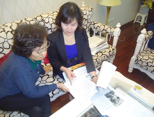 Nhà ngoại cảm Phan Thị Bích Hằng (phải) đang trao đổi về hồ sơ xét nghiệm ADN với nhà giáo Quan Lệ Lan.