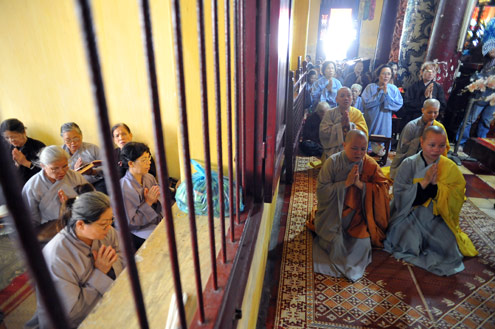 | Trong thời gian diễn ra khóa lễ, các phật tử vẫn chen chân vào đặt đồ lễ |