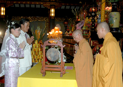 Nghi thức lễ cưới và tiệc cưới chay được tổ chức nơi cửa Phật. Ảnh: TT.