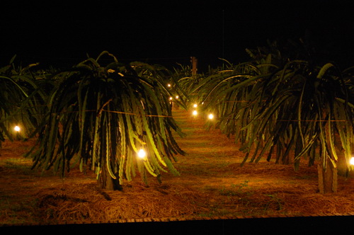 Mỗi tối, để thúc cho cây Thanh Long ra hóa và kết quả kịp cho mùa Tết người dân đã thắp những bóng đèn điện chạy dọc mỗi hàng cây. Những bông hoa Thanh Long vốn giống như hoa Quỳnh, như rực rỡ dưới hơn dưới ánh sáng.