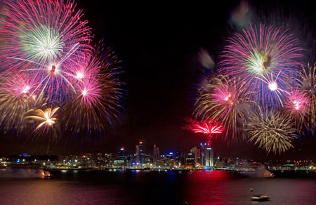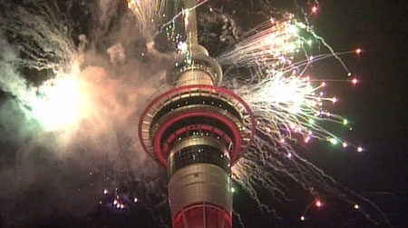 Khi đồng hồ chỉ đúng nửa đêm tại Auckland, thành phố lớn nhất New Zealand, pháo hoa đã được bắn lên từ trên đỉnh tòa tháp Sky cao 328m, tòa nhà cao thứ 15 của thế giới. Hàng chục ngàn người đã quy tụ quanh Vịnh Auckland để chiêm ngưỡng màn pháo hoa tuyệt đẹp có thể thấy ở khắp mọi nơi trong thành phố này.