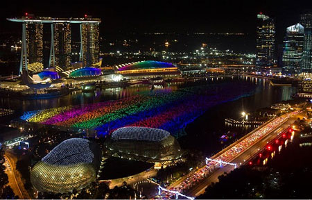 Ánh sáng cầu vòng rực rỡ trên Vịnh Marina, trước màn trình diễn ánh sáng đón chào năm mới tại Singapore.