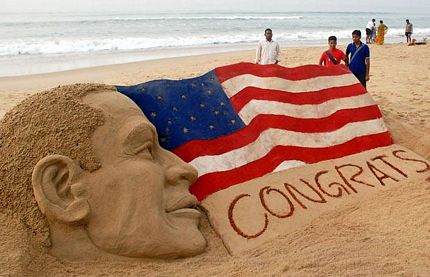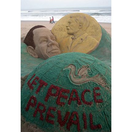 Tác phẩm điêu khắc trên cát chúc mừng Tổng thống Mỹ đoạt giải Nobel Hòa Bình 2009.