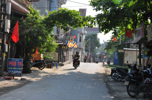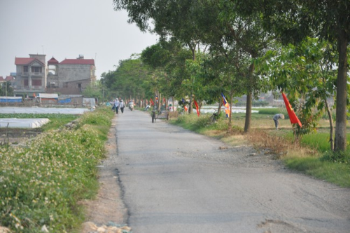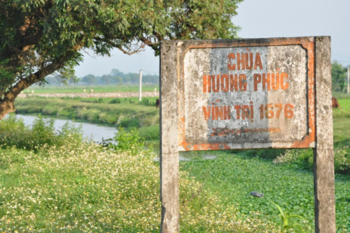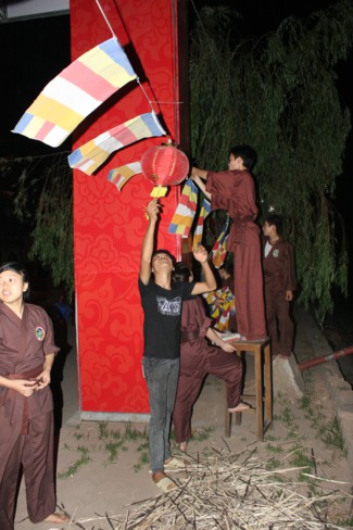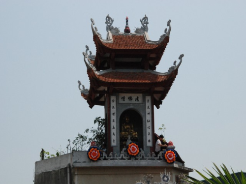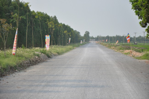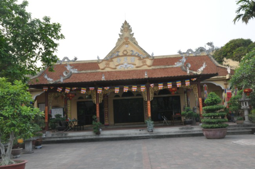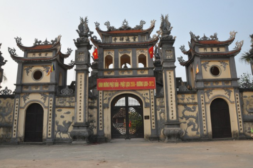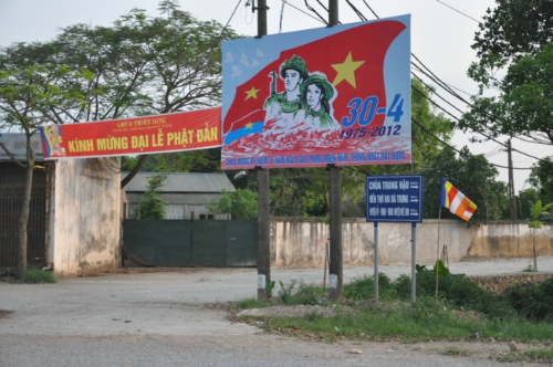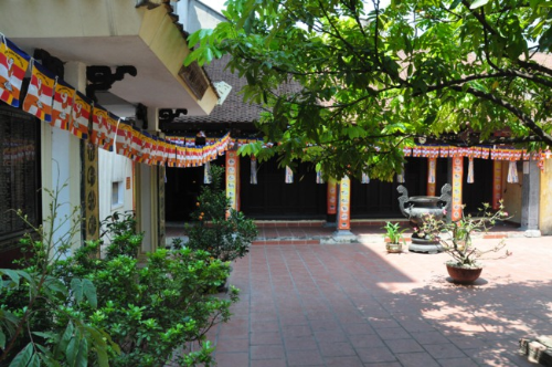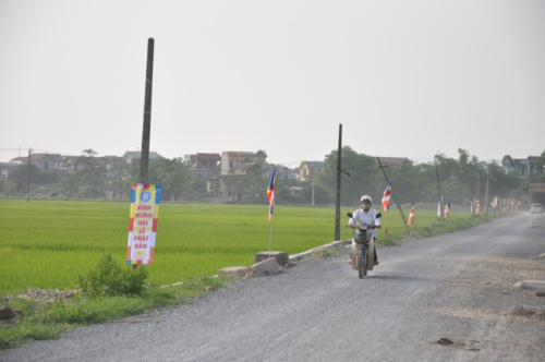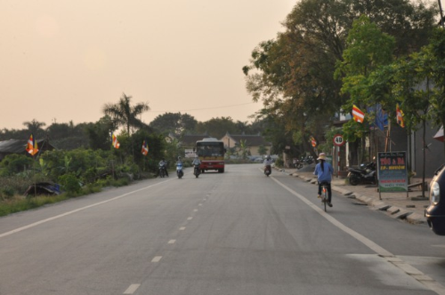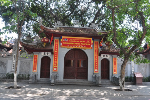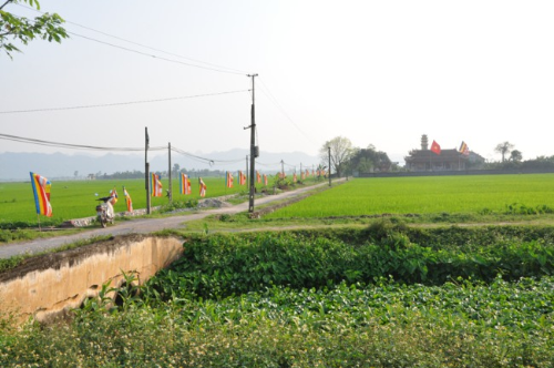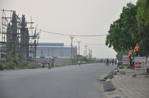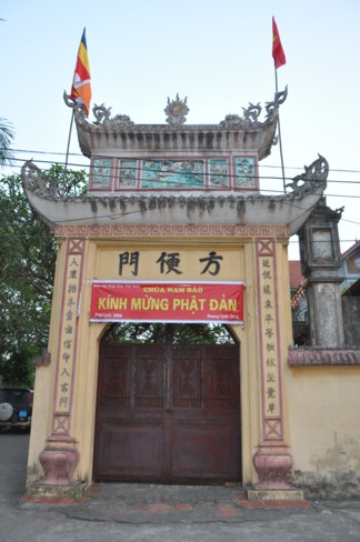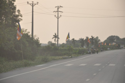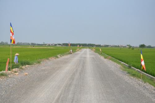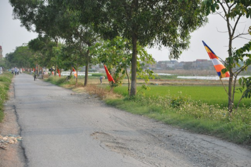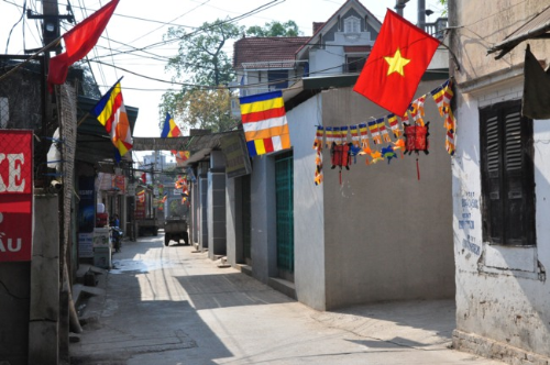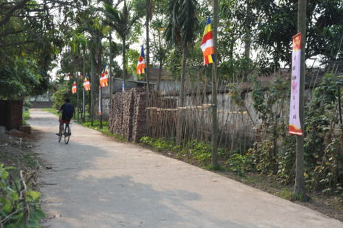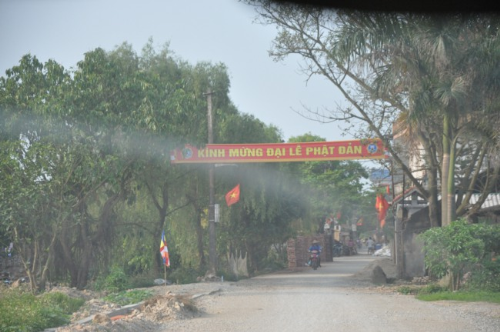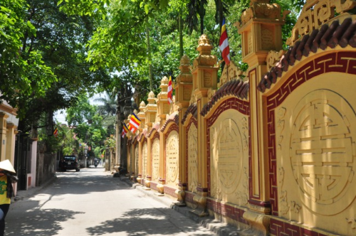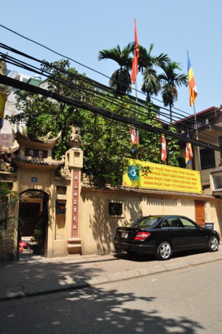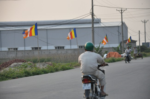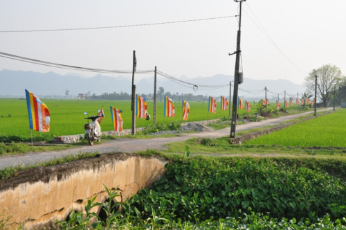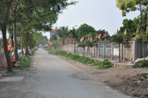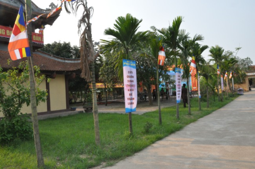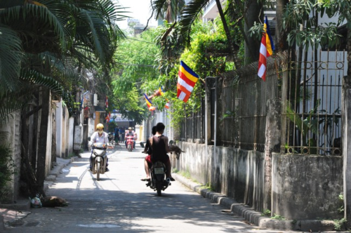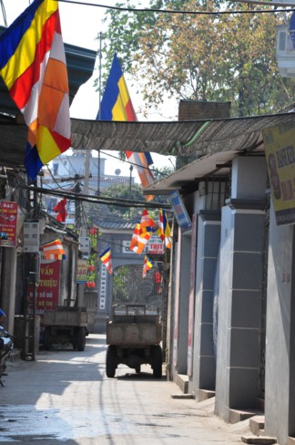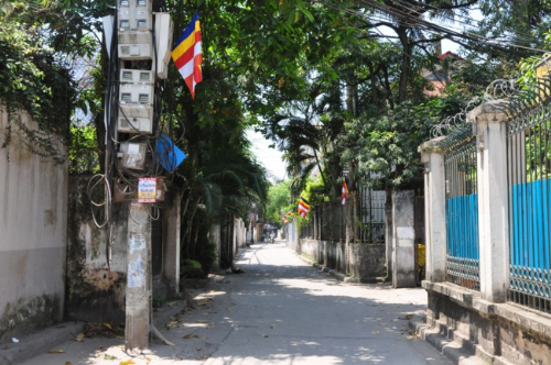 Lối vào chùa Bồ Đề rực rỡ màu cờ Phật giáo