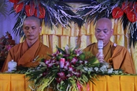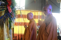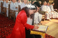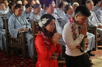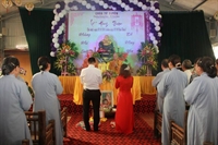 Các bạn đã đối trước Tam Bảo đọc lời thệ nguyện yêu thương nhau trọn đời và hộ trì chính pháp; đảnh lễ công ơn sinh thành, dưỡng dục của song thân; đỉnh lễ tôn trọng sự bình đẳng của nhau. Sau đó, đích thân Thượng tọa trao nhẫn và trao quà cưới cho hai bạn. Trong niềm hoan hỷ của buổi lễ, quý Thầy đã khuyến tấn tân lang, tân nương phải sống trọn vẹn bổn phận làm vợ và làm chồng, làm dâu hiền, rể thảo cùng xây dựng gia đình theo tinh thần kinh Thiện Sinh. Đặc biệt quý thầy chia sẻ bí quyết để có một cuộc sống hạnh phúc dựa trên sự hiểu biết, thương yêu và thực hành năm giới dành cho người Phật tử tại gia.