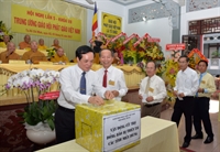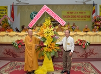 HT.Thích Thiện Nhơn đón nhận lẵng hoa chúc mừng của UBMTTQ Trung ương từ ông Lê Bá Trình