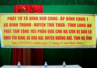 Tối 20 giờ ngày 19/12/2016, Ban Từ Thiện Tổ Đình Kim Cang ấp Bình Cang 1, xã Bình Thạnh, huyện Thủ Thừa, tỉnh Long An đã khởi hành trong sự hướng dẫn của đại đức Thích An Điền – Trưởng ban Từ thiện GHPGVN huyện Thủ Thừa (trưởng đoàn), đại đức Thích An Phúc – Trưởng ban Thông tin cùng đại đức Thích Minh Trí – Phó ban truyền thông Phật giáo huyện Thủ Thừa – chư Phật tử Tổ Đình Kim Cang; Chùa Đông Phước Q8, Tp.HCM – Phật tử Bến Tre cùng phái đoàn đã đến tận nơi thăm hỏi và tặng quà cho đồng bào miền Trung.