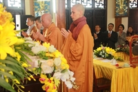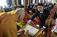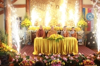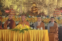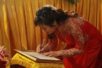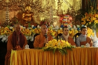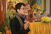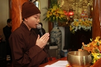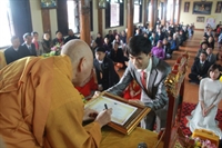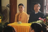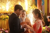 Các bạn đã đối trước Tam Bảo đọc lời thệ nguyện yêu thương nhau trọn đời và hộ trì chính pháp; đảnh lễ công ơn sinh thành, dưỡng dục của song thân; đỉnh lễ tôn trọng sự bình đẳng của nhau. Sau đó, đích thân Thượng tọa trao nhẫn và trao quà cưới cho hai bạn. Trong niềm hoan hỷ của buổi lễ, quý Thầy đã khuyến tấn tân lang, tân nương phải sống trọn vẹn bổn phận làm vợ và làm chồng, làm dâu hiền, rể thảo cùng xây dựng gia đình theo tinh thần kinh Thiện Sinh. Đặc biệt quý thầy chia sẻ bí quyết để có một cuộc sống hạnh phúc dựa trên sự hiểu biết, thương yêu và thực hành năm giới dành cho người Phật tử tại gia.