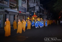 Đoàn cung thỉnh kiệu hoa Đức Phật đản sinh trang nghiêm với đại kỳ Tổ quốc và Phật giáo, chiêng trống, tràng phan, chư Tăng Ni hai tay nâng Đức Phật đản sinh nhỏ trên tay, chư Tăng thuộc đội nhạc bát âm và kiền chùy, trống tay, pháp loa, phan đèn, đỉnh trầm trang nghiêm, đoàn Phật tử với áo dài truyền thống. Nối tiếp sau đó là chư tôn đức giáo phẩm Ban Trị sự PG TP, 24 BTS PG quận, huyện, kiệu hoa với tôn tượng kim thân Đức Phật đản sinh, tiếp đến là chư tôn đức Tăng Ni, Phật tử cầm cờ ngũ sắc, tôn tượng Đức Phật sơ sinh mini nối bước.