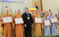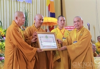 HT.Thích Thiện Pháp tặng bằng Tuyên dương công đức của TƯGH - Ảnh: Bảo Thiên
