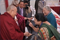 Trên Pháp tòa, Ngài trao chiếc khăn choàng truyền thống. Ngài đã hòa mình trong ánh đèn lung linh, các thành viên của dàn hợp xướng, một khúc hát đại đoàn kết. Bà Giáo sư Ameeta Mulla Wattal tuyên bố rằng: “Là một giáo viên và đồng nghiệp của tôi đều tự cảm thấy có trách nhiệm của mình để định hình tâm trí của thế hệ trẻ với quan điểm cho rằng Từ bi là giải pháp trị liệu. Giáo sư cho biết; họ đã ước mơ được thỉnh đức Đạt Lai Lạt Ma chia sẻ Pháp thoại tại các trường học và bây giờ rất hài lòng với giấc mơ đã thành hiện thực. Giáo sư thỉnh cầu Ngài tương tác các tâm hồn trẻ và giáo viên để cùng chia sẻ Pháp thoại.