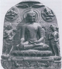 sự chiến thắng của mình trước bọn ma vương(điêu khắc nổi thuộc triều đại Pala-sena, Ấn Độ, thế kỷ thứ X,đá Basalt màu đen, bảo tàng viện Guimet-Paris)