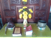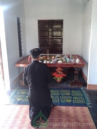 Gia đình gia chủ thờ gia tiên, ông bà ở phía sau. Phía trước thờ Phật Bà Quan Âm. Vậy là tất cả cùng ngồi trước bàn thờ Phật Bà để tụng kinh, niệm Phât và làm các nghi lễ. Người lớn và trẻ con, già và trẻ cùng đều tụng kinh.