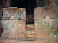 Đài thờ trong động Chiêm Thành có bốn khối đá gồm hai phần; phần trên chạm hai vị môn thần.