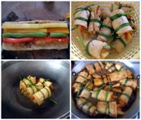 - Xếp cà rốt, khoai lang, đậu cove, ớt sợi lên miếng đậu, cuốn tròn lại, dùng bông hẹ chần cột lại. Đem chiên sơ để định hình.